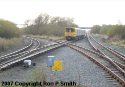 The photo on the right shows the trackwork west of the station as seen from the limit of the platform. The train shown in the picture has just left Bidston for West Kirby while the tracks to the left of the view (without electric "third rail") connect to Upton. |