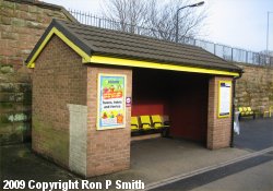 The photo on the right shows the modern shelter on the eastbound platform of the station.
